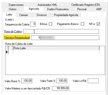 Caminho: Administrador > Cliente > Aba Agrícola > Leite > Técnico Responsável
