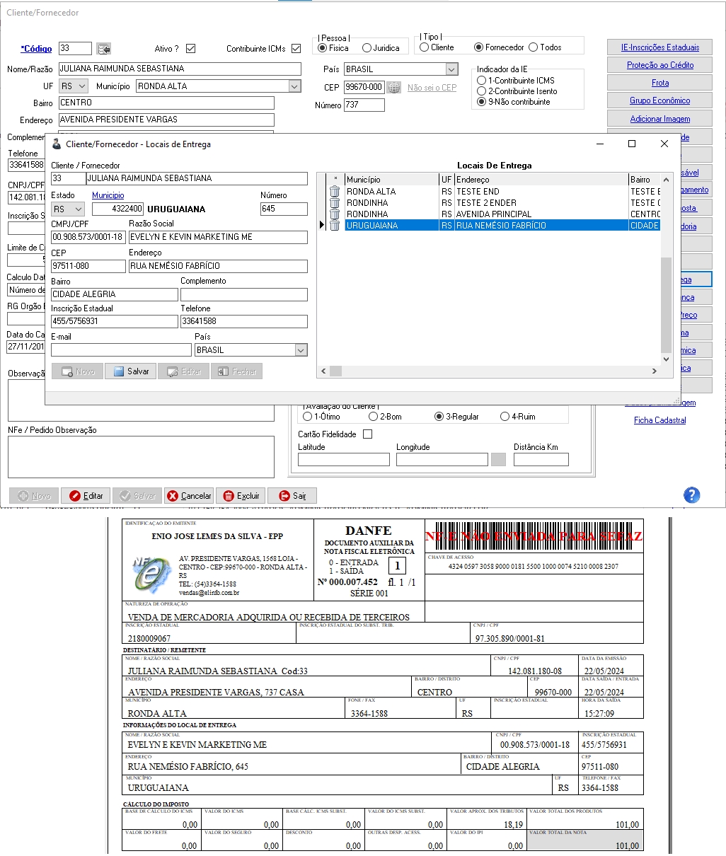 Adicionado os campos CNPJ/CPF, razão social e inscrição estadual nos Locais de entrega, permitindo adicionar outro nome ou cnpj/cpf. Dessa forma, quando gerar a nota fiscal, as informações serão atualizadas conforme os dados cadastrados.