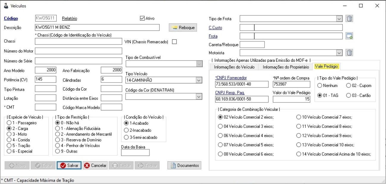 Ao informar um veículo no MDF-e, o sistema passará a incluir automaticamente os dados do vale-pedágio, caso o veículo possua essa informação cadastrada.