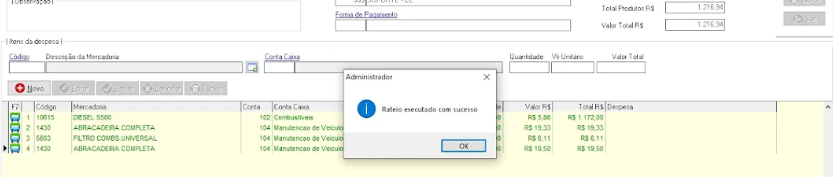 Ao confirmar, o sistema efetua o rateio automaticamente entre os itens lançados e altera o status para Finalizado.
