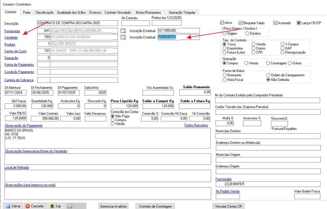 Caminho: Cereais > Contrato
