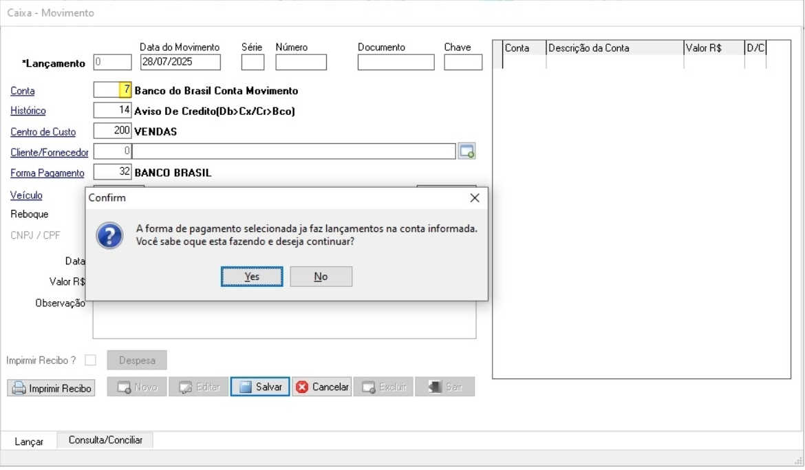 No lançamento manual no caixa, foi implementada uma verificação que exibe uma mensagem quando a conta do caixa é a mesma da forma de pagamento. O usuário será alertado com a seguinte mensagem na tela: "A forma de pagamento selecionada já realiza lançamentos na conta informada. Você tem certeza do que está fazendo e deseja continuar?".