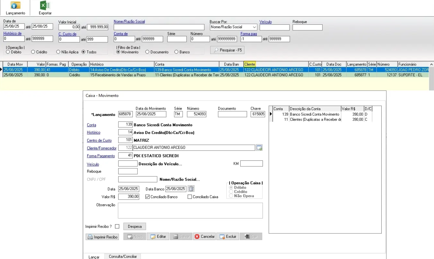 ADMINISTRADOR | Caixa baixas com PIX não aparecem o cliente no lançamento do banco