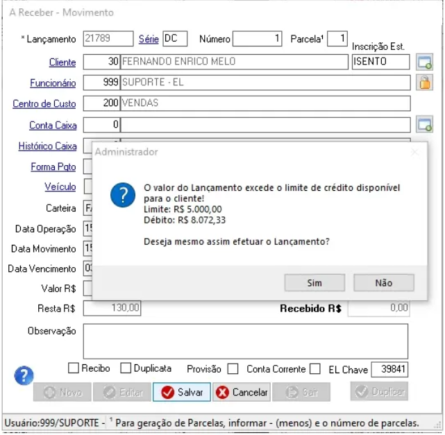Ao efetuar lançamentos manualmente do Contas a receber o sistema validará o limite de crédito do cliente. Se o valor ultrapassar o configurado no cadastro, uma mensagem será exibida perguntando se o usuário deseja continuar. O histórico registrará a identificação do usuário que autorizou a operação.