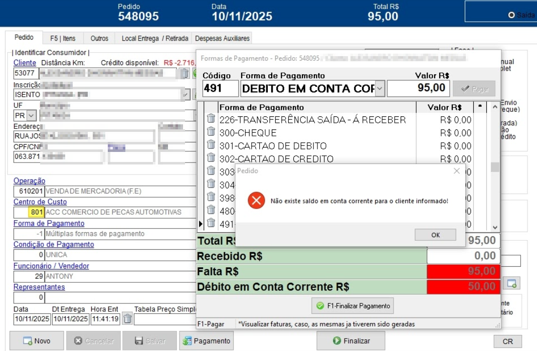 Quando estiver em outro centro de custo diferente e não tiver saldo vai mostrar mensagem na tela "Não existe saldo em conta corrente para o cliente informado!" e não vai permitir continuar.