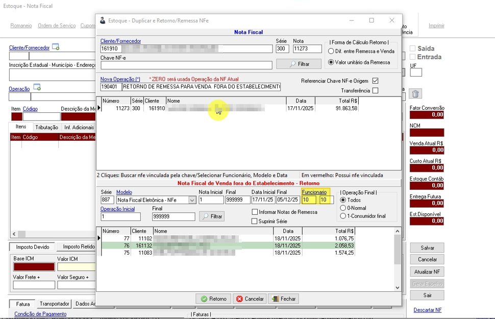 Corrigido um problema na nota de retorno em que o campo Funcionário era alterado automaticamente ao selecionar a nota.
